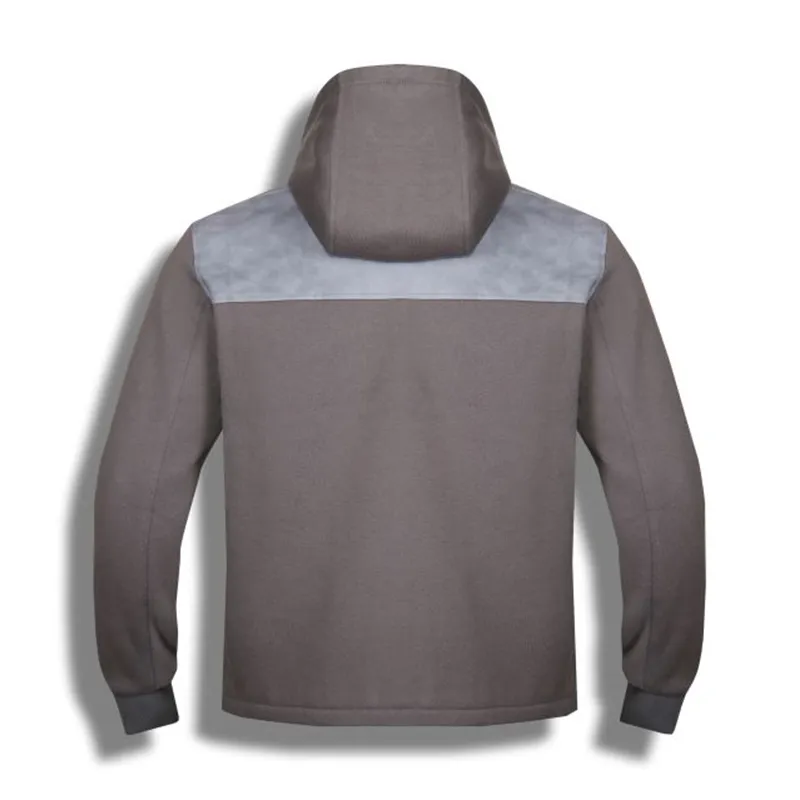 Эта мужская куртка — официальный заказ бренда, тщательно изготовленный с целью достичь винтажной эстетики пэчворка и премиальной текстуры. Она выполнена из серого трикотажа в сочетании с светло-серыми вставками из замши; трикотажные части обеспечивают мягкость на коже, а замшевые вставки отличаются изысканной текстурой с присущим винтажным, потертым характером. Капюшон застегивается на черную молнию, а геометрические замшевые карманы и детали на плечах подчеркивают винтажный стиль рабочей одежды. Чистый, непринужденный силуэт подойдет мужчинам, которые ищут для своего гардероба «ретро-пэчворк с текстурной структурой», демонстрируя тщательное мастерство бренда в создании верхней одежды в винтажном стиле.