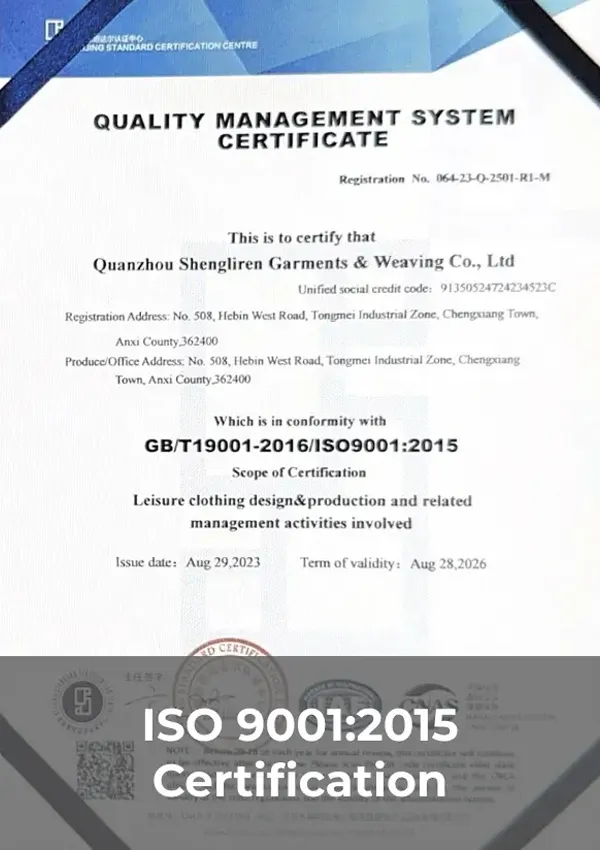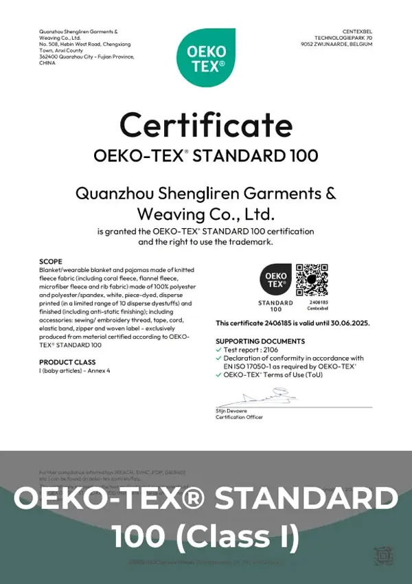 Наш завод Шэнлижэнь имеет международные аккредитации, в том числе сертификат OEKO-TEX STANDARD 100 Class 1 для младенцев и детей младшего возраста, BSCI и ISO9001. Мы успешно прошли аудиты таких известных предприятий, как Costco, Disney, Walmart и TUV Rheinland, что гарантирует соответствие нашей продукции строгим стандартам международных рынков, включая Европу и Америку.